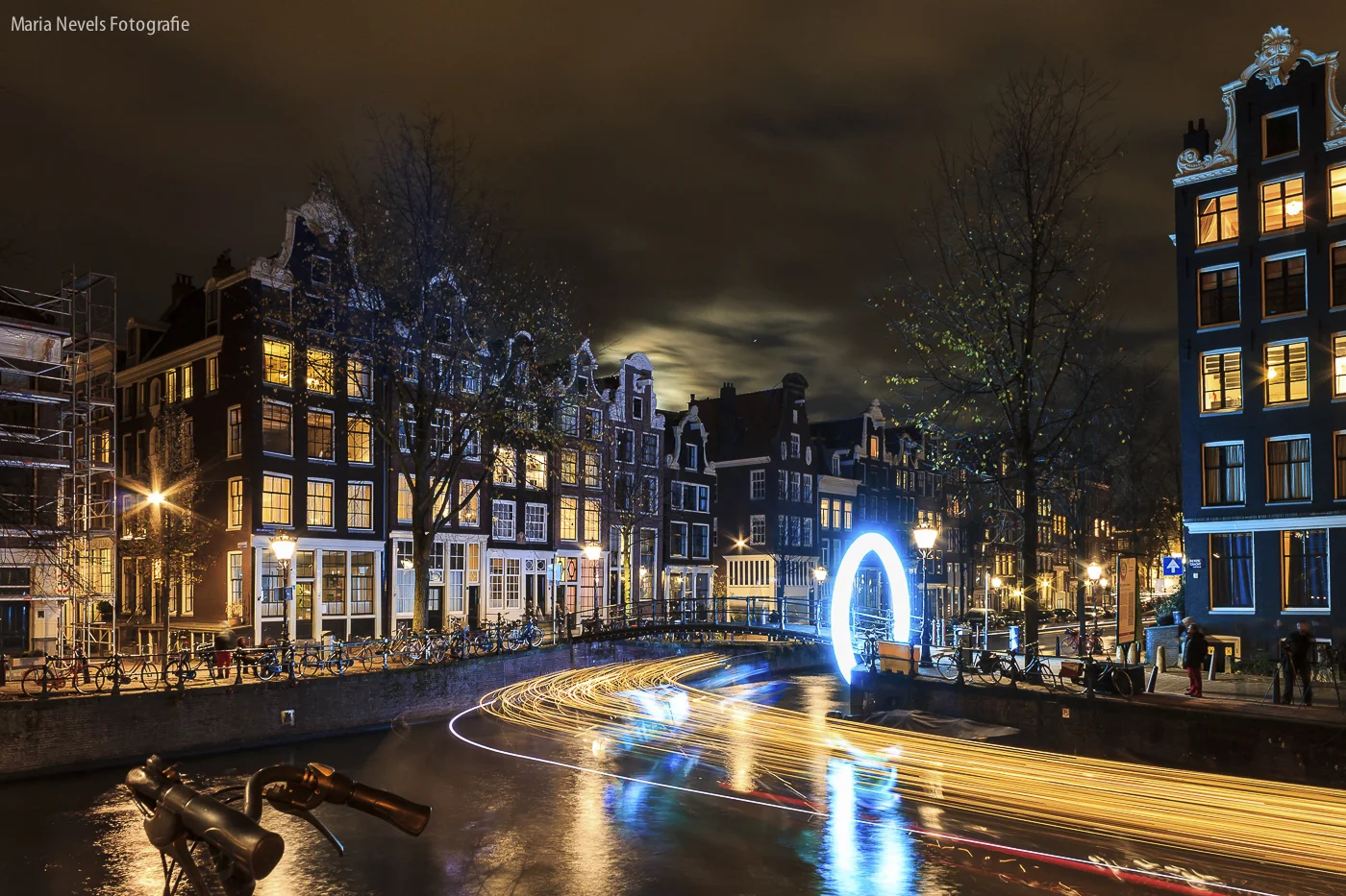 De tweede foto is van het Amsterdam Light Festival van 2015. Een typische Amsterdamse plaat gemaakt aan de gracht met zicht op de pakhuizen, de vele fietsen en de lichtstrepen van de rondvaartboten die langs de lichtkunstwerken varen.